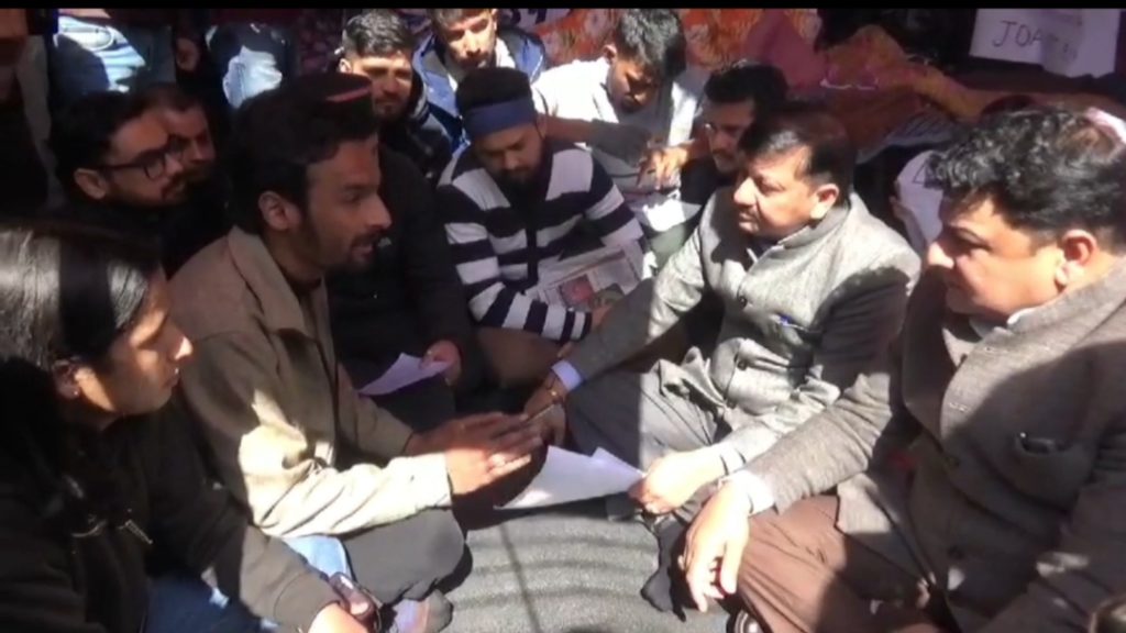 शिमला : संजु चौधरी ( TSN)- एक तरफ विधानसभा के अंदर बजट पर चर्चा जारी है, वहीं दूसरी ओर चौड़ा मैदान में JOA IT अभ्यर्थी लगातार धरने पर हैं. अपने परीक्षा परिणाम घोषित करने को लेकर मांग कर रहे JOA IT अभ्यर्थियों तमाम मुश्किलों के बावजूद हड़ताल पर बैठे हुए हैं. ऐसे में कांग्रेस की पूर्व सरकार में मंत्री और वर्तमान में विधायक सुधीर शर्मा और कांग्रेस विधायक राजेंद्र राणा अभ्यर्थियों से मिलने चौड़ा मैदान पहुंचे. जहां उन्होंने उनका हाल जाना और अभ्यर्थियों के मामले को सरकार के समक्ष उठाने का आश्वासन दिया.